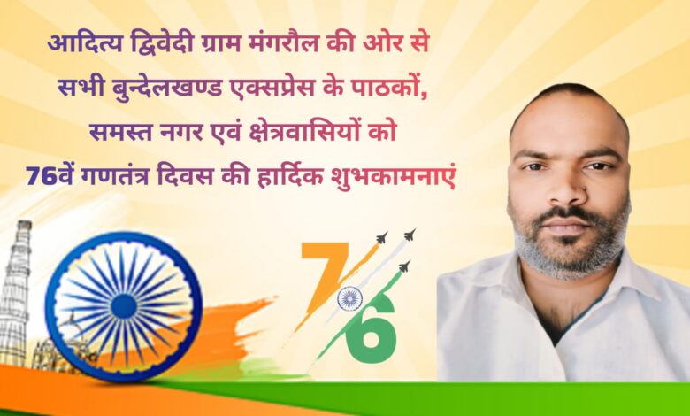 तहसील कालपी आदित्य द्विवेदी ग्राम मंगरौल की ओर से सभी बुन्देलखण्ड एक्सप्रेस के पाठकों, समस्त नगर एवं क्षेत्रवासियों को 76वें गणतंत्र दिवस की हार्दिक शुभकामनाएं Web1Tech Team Send an email 26/01/20250 92 Facebook Twitter LinkedIn Pinterest Messenger Messenger WhatsApp Telegram Share via Email Print “आओ झुक कर करें सलाम उन्हें, जिनकी वजह से ये दिन आता है। दिल से सभी को गणतंत्र दिवस की बधाई!” Web1Tech Team Send an email 26/01/20250 92 Facebook Twitter LinkedIn Pinterest Messenger Messenger WhatsApp Telegram Share via Email Print Share Facebook Twitter LinkedIn Messenger Messenger WhatsApp Telegram Share via Email Print